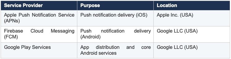 • Push notification tokens – device tokens issued by Apple Push Notification Service (APNs) or Firebase Cloud Messaging (FCM) to deliver notifications.